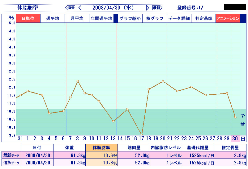 しかも、1日で1kg単位の変動がちょくちょくあるのな。これだけ変わるのなら、毎日の体重を気にするよりは、1週間または1ヵ月後との平均体重を気にしたほうが良いのかも。BC-500に付属しているソフトは「週平均」「月平均」などでもデータを見ることができて便利だね。