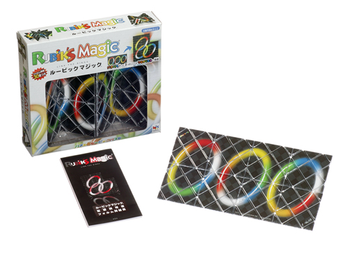 この「ルービックマジック」は、8枚の正方形の板がワイヤーでつながっているパズルで、パタパタと折りたたむことで、色々な形に変えることができる。このパズルの一番最初の目的は、板に描かれた3個の輪をつなげること。