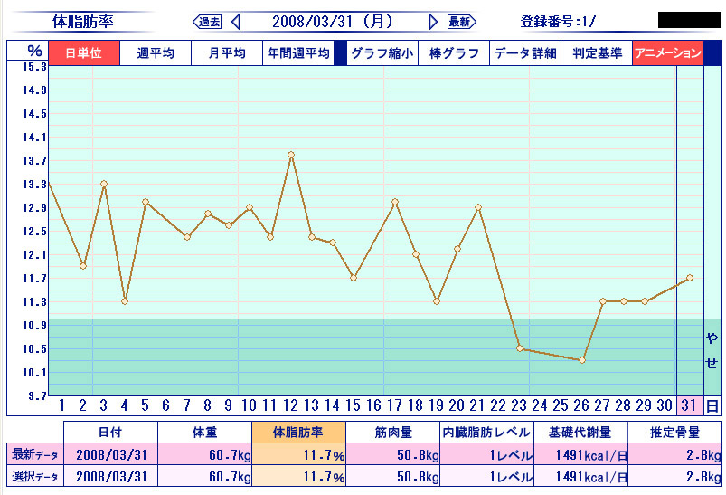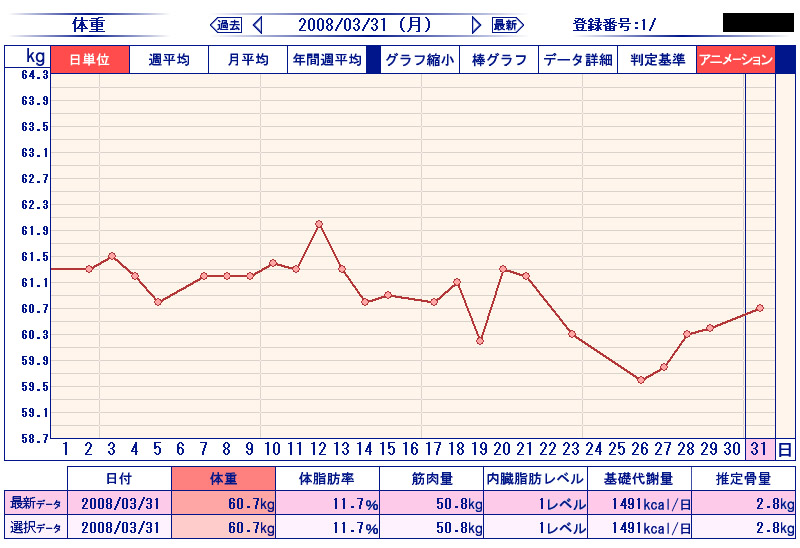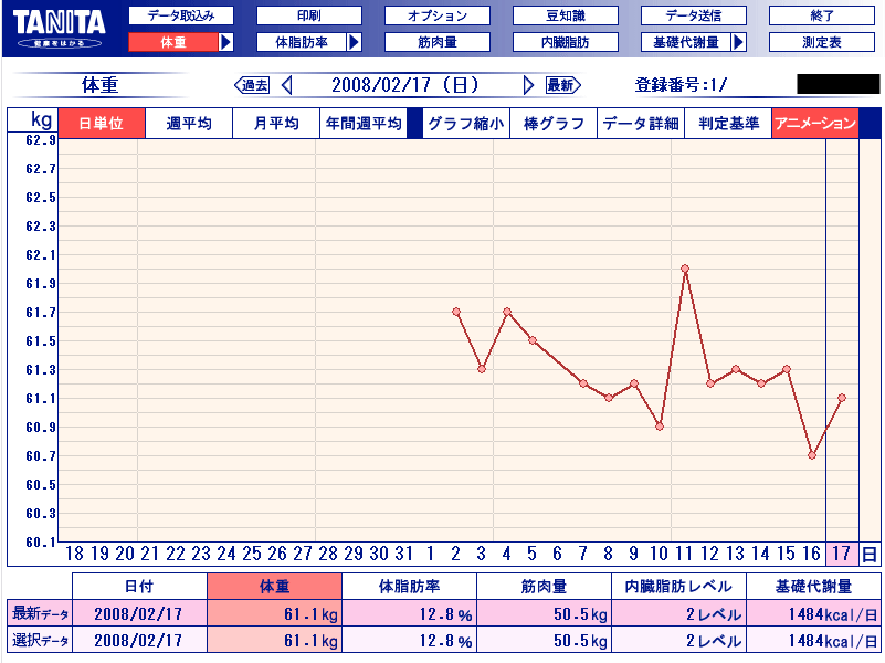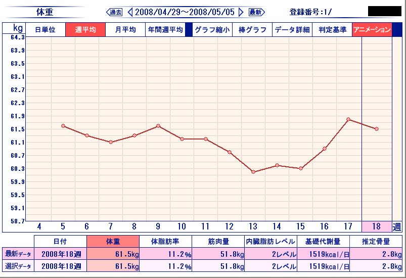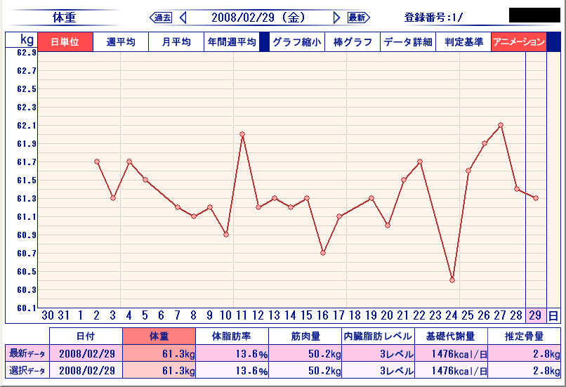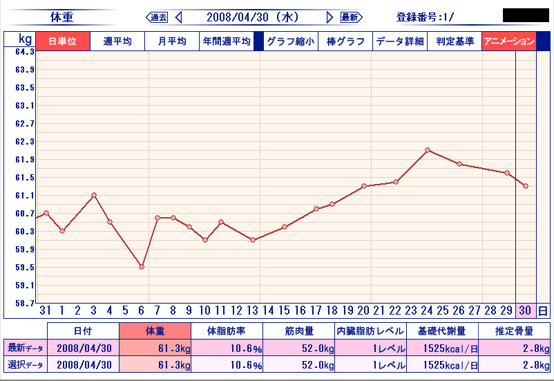 しかも、1日で1kg単位の変動がちょくちょくあるのな。これだけ変わるのなら、毎日の体重を気にするよりは、1週間または1ヵ月後との平均体重を気にしたほうが良いのかも。BC-500に付属しているソフトは「週平均」「月平均」などでもデータを見ることができて便利だね。
