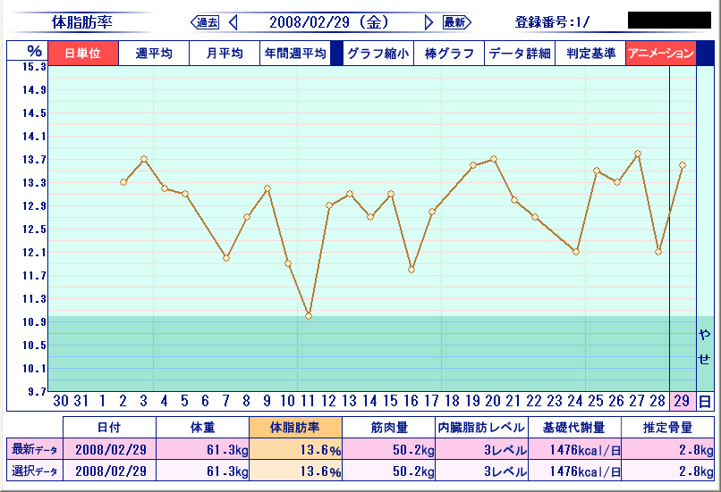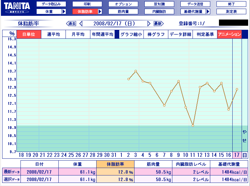 というわけで、毎日計測する動機付けのために、毎月1回体重と体脂肪率を公開することにした。とりあえず3ヶ月続けてみようかと。今回は2008年2月分のデータを公開。