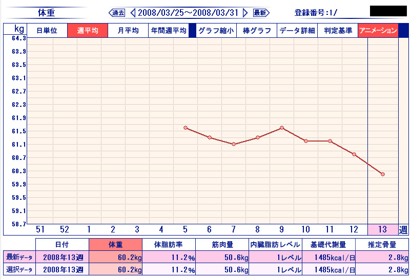 2008年の2月頭から計測を始めたので、目盛りは「第5週」からスタート。そこから約2ヶ月間の週平均体重が上のグラフ。2月頭と比べると、1kg以上減っているのが分かると思う。