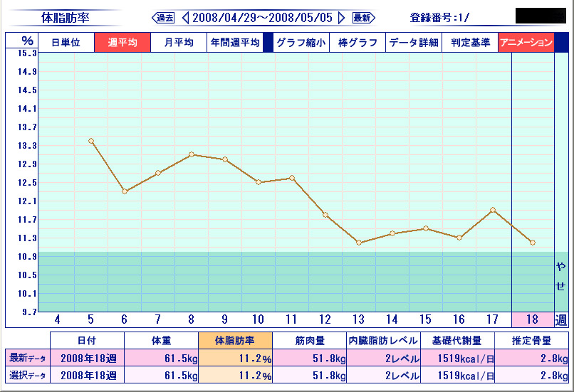 体重は、3月にいったん落ちたものの、4月に元に戻ってしまったことがはっきり分かる。それと比べると、体脂肪率は着実に落ちている・・・ということでいいよね?