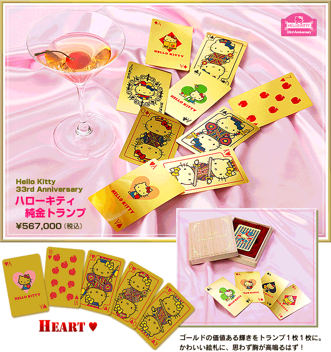 一応「トランプ」なのでgeme枠に入れてみた。さて、怒涛の勢いでグッズが出まくるハローキティ。今回は「純金で出来たトランプ」、お値段567,000円!!もちろんもったいなくて遊べないよ!