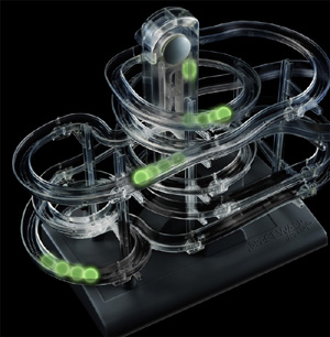 本体の大きさは、幅30.8cm×高さ23.2cm×奥行き15cmということで、これなら何とか場所を確保できそう!そして「SPACEWARP desktop」は組み立て簡単、さらにボールが蓄光色なので、暗闇で光るらしい。さらにエレベータの入り口にはLEDブラックライトが設置されていて、電池の続く限りはボールは光り放題・・・!