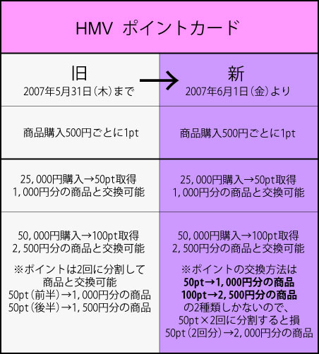 先日「タワーレコードのポイントカード、還元率ダウン」を書いたときに、HMVのほうも調べたら、こちらは6月1日付けで新ポイントサービスがスタートしていた!