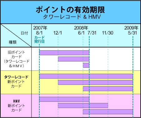 旧ポイントカード(タワレコ、HMV共)のポイント有効期限は、「カード発行日より1年間」(正確には翌年同日の1日前まで)。この場合だと、2007年8月1日にカードが発行されたので、それ以降に発生したポイントを含めたすべてのポイントの有効期限が、1年後の2008年7月31日となる。この場合、3回目のポイントが有効だった期限は6月1日~7月31日の、たった2ヶ月間だけだったことになるね。